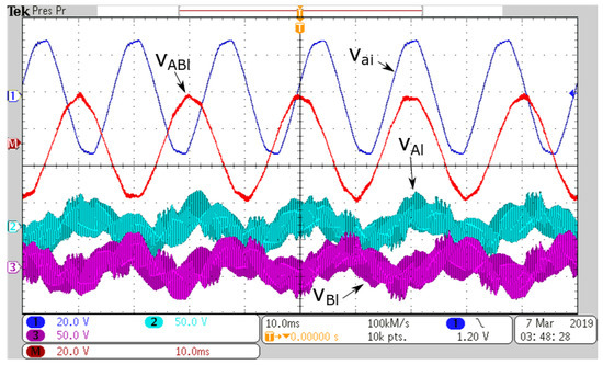Finally, the developed MC architecture was tested to validate the proper operation of the MC when both the four-step commutation strategy and the SVD modulation technique were implemented in the same processing board. Figure 12 exhibits the 60-Hz phase a input voltage () and the 50-Hz filtered line-to-line output voltage () signals, demonstrating that the prototype is able to generate the characteristic MC output voltage signals ( and ) effectively with no significant low order harmonics, as can be seen from voltage signal ().
