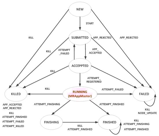In YARN, RMApp is a data structure that preserves an application life cycle in RM. Its realization class is RMAppImpl. This class maintains an application state machine that records several application states and state-driven events. The finite-state machine (FSM) of RMAppImpl is shown in Figure 4. When MRAppMaster is launched, the application will enter into the core state “RUNNING.” Every application may run several times. The transitions of states are determined by the return values of MRAppMaster. RMApp judges that an application has failed when all RMAppAttempts failed. Therefore, MRAppMaster is the most important module in SHIYF.