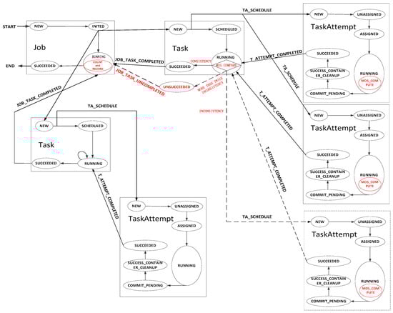 Finally, the FSM of the SHIYF Job is shown in Figure A3. When the job entered a “RUNNING” state, the entire event would turned into task until it returned the trigger events (e.g., JOB_TASK_ATTEMPT_COMPLETED, JOB_MAP_TASK_RESCHEDULED, JOB_TASK_ATTEMPT_FETCH_FAILURE, JOB_TASK_COMPLETED, and JOB_COMPLETED). The trigger events and the corresponding states marked with red in Figure A3 must be redesigned. For instance, when SHIYF Job received the “JOB_TASK_COMPLETED” trigger event, it not only calculated the numbers of completed tasks, failed tasks, and killed tasks, but also recorded the hostnames of the malicious nodes and the potential ones.