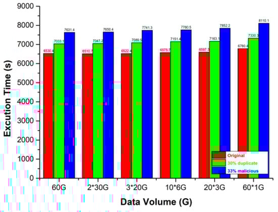 - In the 33.3% malicious nodes condition, execution time increases by approximately 16% because of the extra speculative TaskAttempts and the inconformity of two comparative MD5 hashes.