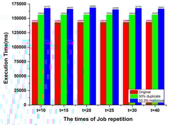 MRBench repeats a minor job many times, as specified by the user, to check whether the minor job running on a Hadoop cluster is repeatable and efficient. MRBench is used to test the performance to handle many minor jobs, and it has the security protection ability of SHIYF. Therefore, the times of job repetition t are set as 10, 15, 20, 25, 30, and 40, based on Section 3. Several parameters should be set as follows: