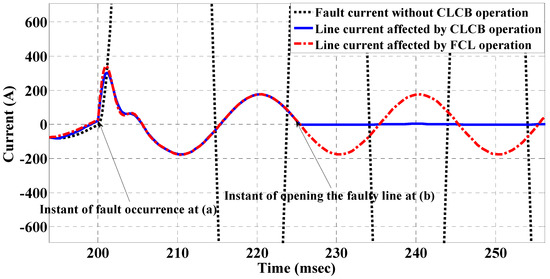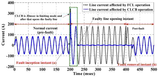 In the instant of fault inception, the first peak of the fault current decreased and after that the limited fault current reached an acceptable level. The blue solid plot shows the line current during normal and fault operation modes affected by the proposed CLCB. At the first cycle of the line fault current, the proposed CLCB acted as a fault current limiter. Then it opened up the faulty line, and current decayed to zero.