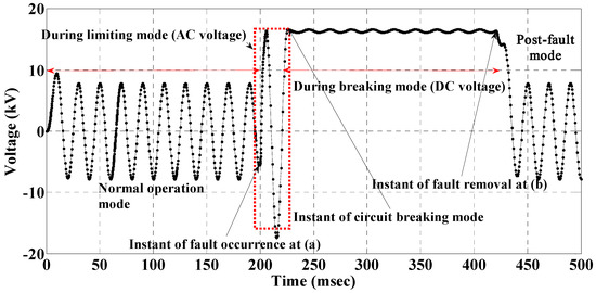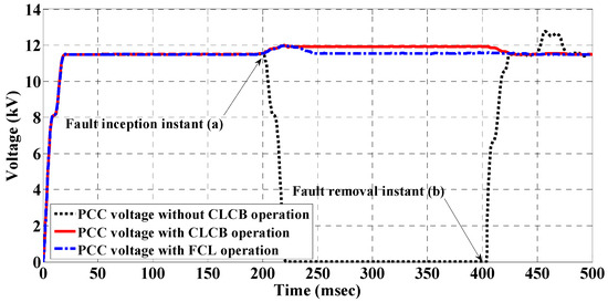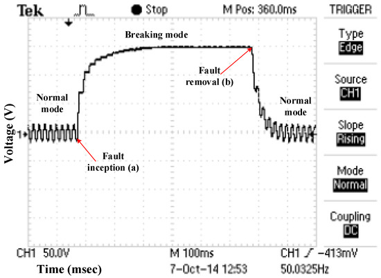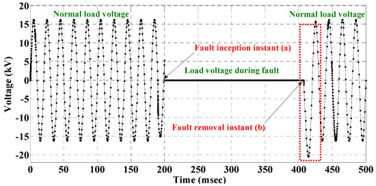 The load voltage during normal and fault operation modes is shown in Figure 9. The fault occurred at instant (a) and the voltage of the load decreased to zero. At instant (b), the fault was cleared and the load voltage returned to the pre-fault value.