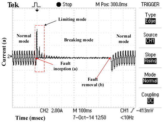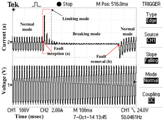 Figure 12 shows the line current during the normal and fault operation modes. In this plot, the phase to ground fault occurred at instant (a) via a mechanical switch and was cleared up at instant (b) by the opening of the mechanical switch. As shown here, after the fault occurrence, the CLCB limited the fault current, opened the faulty line, and decreased the fault current to zero. After fault clearance, CLCB recovered the faulty line in less than 20 ms. This measured curve is in fair agreement with Figure 6.