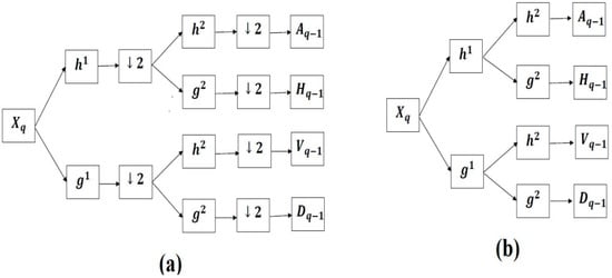 (a) Discrete wavelet transform (DWT) decomposition and (b) stationary wavelet transform (SWT) decomposition.