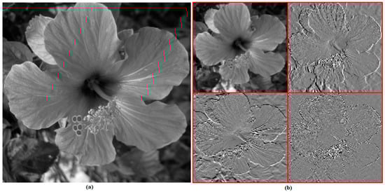 where are the wavelet analysis filters for the SWT. are the wavelet approximation image, horizontal sub-band image, vertical sub-band image, and diagonal sub-band image, respectively. The practical decomposition is shown in Figure 2. In the experimental analysis, we have chosen the wavelet filters, following the convention from [,,]. The wavelet synthesis equation can be given as
