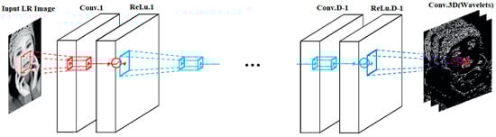 In our network model, we utilize D layers. All the layers in our network are the same except the first and the last. In our network, the first layer has a total of 64 filters. The size of each filter is 1 × 3 × 3 × 64. These filters operate at a 3 × 3 spatial size on 64 channels. These channels are also called feature maps. The first layer is used for the LR input image, and the last layer reconstructs the output image. As the last layer is used for the output image reconstruction, it has three filters, each of size 3 × 3 × 3 × 64. Our network is trained between the input LR image and its corresponding wavelet coefficients. Thus, given an input LR image, the network can predict the corresponding wavelet coefficients for HR image reconstruction. Modeling the image details in the wavelet domain has certain usefulness for the task of SISR [,,]. The proposed model shows that by using wavelet details, the performance of SISR is highly improved. One of the problems pertaining to the deep convolution networks is that size of the output feature maps get reduced after each layer as the convolution operation is performed.