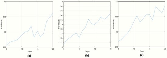Another advantage of using deep networks is that they can model non-linearity very well. In our proposed network architecture, we utilize 19 ReLUs, which allows our network to model highly complex non-linear functions. We experimentally evaluated the performance of deep networks by calculating the network’s PSNR as depth values increased from 5 to 20, only counting the weight layers and excluding the non-linearity layers. The results are shown in Figure 4. In most cases, the performance increases as depth increases.