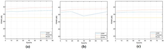 Performance comparison with VDSR and bicubic algorithms based on learning rates: (a) 0.1, (b) 0.01, and (c) 0.001.