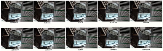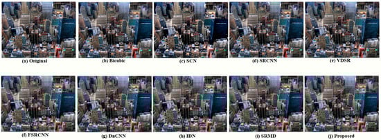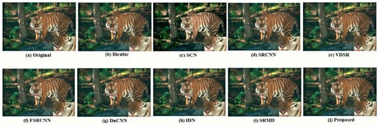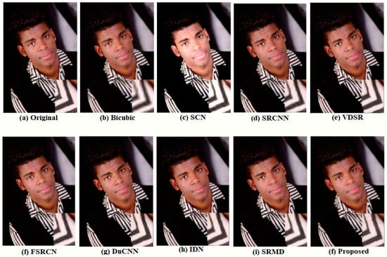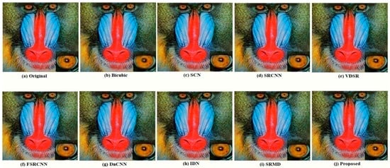 The quantitative analysis based on PSNR and SSIM is shown in Table 2. The algorithms under comparison include the bicubic technique, SRCNN algorithm [], SCN algorithm [], VDSR algorithm [], FSRCNN algorithm [], DnCNN algorithm [], IDN algorithm [], and SRMD algorithm []. In the comparative analysis, the trained models used for these algorithms are provided by the authors. The proposed algorithm gives better results than the algorithms under comparison.