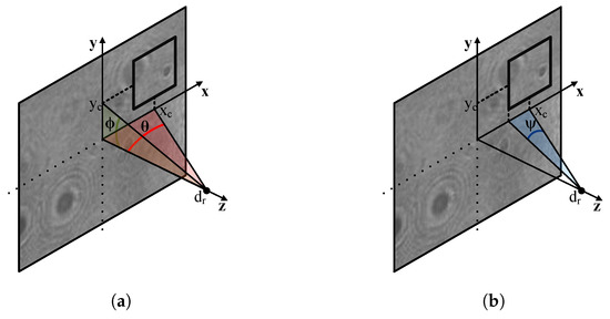 Once the complex matrix representing the hologram is loaded, the next step is to set the view on the scene to be reconstructed: this operation is performed by Set Viewpoint. A specific view on the scene is obtained selecting only a portion of the entire hologram, thus generating the so-called “synthetic aperture” (e.g., if the aperture is positioned on the top-right side of the hologram, the user obtains the top-right view of the scene). To facilitate the aperture positioning, this tool employs two angles, as shown in Figure 2a, in which is the reconstruction distance.