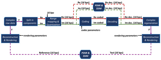 From the raw complex hologram, represented by the Complex raw data block, the real and imaginary components are extracted in the Split in components block. The two components are two distinct real-valued matrices. In the Range mapping & Quantization block these two matrices are quantized with 16 bits per sample (bps), since most of current standard codecs support integer data only. Subsequently, the two quantized components are coded (Coding block) and then decoded (Decoding block) with a standard codec. At this stage, the first quality evaluation is carried out, in the so-called hologram domain. The hologram’s real and imaginary components are compared before and after the compression with the peak signal-to-noise ratio (PSNR) and structural similarity index (SSIM) objective metrics, taking the component before the coding stage as reference. After the decoding process, the Complex regeneration block takes the two components as inputs and merge them again in a single complex matrix. The reconstruction process is then performed from the decoded data (F’), on the right, but also from the original raw data (F), on the left. The Reconstruction & Rendering block is essentially the algorithm described in Section 4.1, with a custom Load Hologram block, in order to load the input data automatically, without user intervention. The two reconstructed images are finally compared with the PSNR and SSIM metrics in the so-called reconstructed domain, taking the image originating from the raw data as reference.