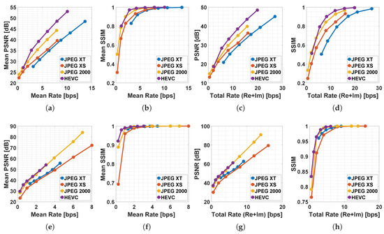 The results obtained in the reconstructed domain, in terms of PSNR, are shown in Figure 5c,g, for Dices 8K and Skull respectively. It can be noted that for both samples the results are very similar to those obtained in the hologram domain. Based on these results, the use of PSNR metric in the hologram domain can be effective in predicting the results that will be obtained on the holographic image, after the hologram reconstruction. The SSIM results (Figure 5d,h) are in accordance with PSNR results also in this domain. It can be also observed that at high bitrates (hence when the holographic image quality is also high), the SSIM discriminates the performance of the various codecs less than the PSNR.