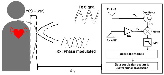 The CW radar for detecting vital signs has exhibited high sensitivity to small displacements with frequency bands of ≥2 GHz because more signal changes can be detected at a higher operating frequency [1,2,3]. A radar sensor operating at a higher frequency also has the advantage of miniaturization, because operating frequency determines the size of the radar module, particularly the size of the antennas [4,5,6]. However, high-frequency signals have difficulty penetrating the inside of the human body, and attenuation loss can be significantly increased when electromagnetic (EM) waves are transmitted through high-dielectric materials, such as muscles and skin [8]. It was previously reported that the signal reflected by the heart is only 4% of the incident signal for a 2.45 GHz CW radar [9]. Even though most of the received signals for a radar sensor operating in the S-band (2 GHz to 4 GHz) or higher are reflected by the chest surface, the radar sensor can detect vital signs because the displacements of heartbeat and respiration are 0.6 and 4−12 mm, respectively [10]. Highly accurate vital signs can be measured using signals reflected from deep inside of the human body, which reflect more information of the characteristics of the heartbeat and respiration, because these displacements are dependent on individual body characteristics and conditions, such as physiology, health, fitness, and age [9,10].