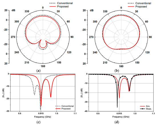 Performances of the conventional antenna and proposed antenna with the fractal-slot: (a) simulated E-plane radiation patterns at 915 MHz; (b) simulated H-plane radiation patterns at 915 MHz; (c) simulated S11 in magnitude; (d) simulated and measured magnitudes of S11 of the proposed antenna.