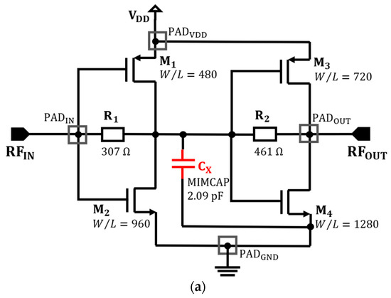 The proposed design can reduce the size of the patch antenna in the 915 MHz band, but measured return loss was 6 dB at the desired center frequency of 915 MHz. Because the low return loss can degrade signal sensitivity, the proposed radar sensor was implemented with an LNA connected to the antenna for impedance matching. The wideband LNA shown in Figure 5 is proposed to improve the sensitivity of the radar sensor and impedance matching with the antenna. The proposed LNA is a two-stage inverter-based amplifier with resistive feedback. Inverter-type LNA achieves wideband input- and output-impedance matching using feedback resistors, according to the size of the n- and p-type metal-oxide semiconductor transistors [29]. However, impedance mismatching may be generated to obtain the desired voltage gain in the inverter-based LNA, because the transconductances and output resistances of the transistors affect the wideband input and output matching characteristics and the voltage gain. Impedance mismatch can be compensated by adding capacitance Cx, shown in Figure 5a, between the first and second stages in the proposed LNA. Additional capacitance Cx can not only increase the degree of freedom in the inverter-based LNA design without increasing the noise figure but also be useful for achieving impedance matching with the proposed fractal-slot antenna. Capacitance characteristics at the input of the LNA can be designed to compensate for the inductance characteristics of the antenna, because the input capacitance of the first stage, which depends on the size of the transistors, can be adjusted by changing capacitance Cx.