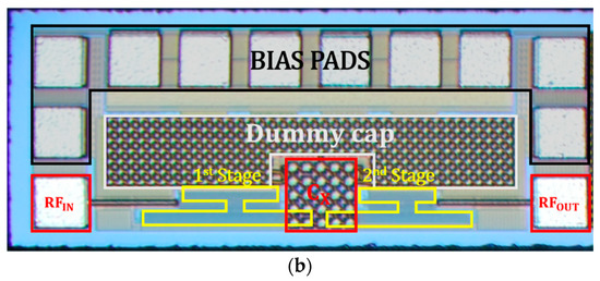 Proposed two-stage low-noise amplifier (LNA) in the radar sensor: (a) schematic of the LNA including external bond-wire inductances, and discrete and pad capacitances; (b) photograph of the fabricated LNA.