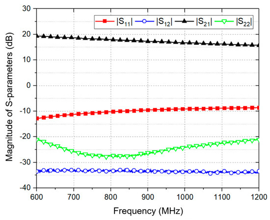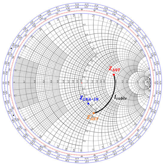 Figure 6 shows the magnitudes of the measured S-parameters of the proposed LNA. Degradation in the measured voltage gain and input matching was caused by the difference in bond-wire inductance between simulation and implementation. The magnitude of the input reflection coefficient was degraded; however, the Smith chart in Figure 7 shows that impedance ZANT of the antenna was matched with input impedance ZLNA of the LNA using a radiofrequency cable with a characteristic impedance of 50 Ω and a length lcable of 200 mm. The return loss of the antenna connected to the LNA was calculated to be 12.8 dB.