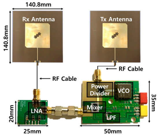 The front-end module of the 915 MHz CW radar sensor shown in Figure 8 was implemented on an FR4 PCB with a thickness of 1 mm. Signals of 915 MHz with an output power of 9 dBm were generated at the voltage-controlled oscillator (VCO) and divided into LO and Tx paths by a power divider with an insertion loss of 0.4 dB. The maximum output power of the transmitted signal was less than 3 dBm because of the input return loss of the proposed antenna and the intrinsic loss of the connectors. Additionally, the reflected signal was received by the proposed antenna and amplified using the chip-on-board LNA with a voltage gain of 17 dB at 915 MHz. The received signal was downconverted to the baseband signal by a passive mixer with a conversion gain of −7.54 dB and a low-pass filter with a cutoff frequency of 80 MHz. The board size of the front-end module is 50 × 35 mm.