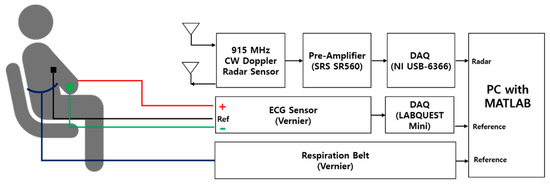 Measurement setup for vital-sign detection using the 915 MHz radar and the reference electrocardiogram (ECG) sensors.