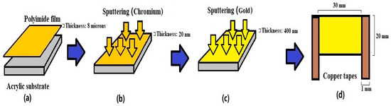 The sensors’ patches were fabricated in laboratory conditions in conditions with fixed temperature and humidity. Figure 1 shows the schematic diagram of the steps of fabrication of the sensor patches. Commercial polyimide films (ALFA (AESAR, 41896, GH, Haverhill, MA, USA) having a thickness of 8 microns were taken as substrate and attached on acrylic templates with biocompatible tapes (3M 810D Ruban MagiqueMC, Sydney, Australia) for sputtering purposes. Magnetron sputtering was done using an Emitech k550 device to form the conductive layers on the thin-film substrates. This was performed by placing the sample on the middle of the device to obtain the maximum degree of sputtering on the substrates. The samples were initially placed inside the sputtering device, and then chromium and gold were selected as the targets for the sputtering process. Chromium was used for better adhesion of gold layer on the polyimide substrates. The phenomenon took place in the plasma environment where the current varied between 0 and 20 mA. The thickness of the chromium layer was kept fixed at 20 nm, while the thickness of the gold layer was varied between 200 nm and 400 nm to determine the correct level for optimised performances. This method of selecting the thickness of sputtered gold was based on some of the previous research [38,39] done by our group on MEMS-based sensors. In the previous work, the thickness of the chromium layer was chosen to be 20 microns, while 500 microns was set for the gold layer. In the current work, we set the range of the thickness of the thin-film gold layer between 200 nm and 500 nm with a difference of 100 nm. The quality of these four thicknesses was determined based on the consistency of their responses and the adhesive of the sputtered gold layer. The surface adhesion of gold layers was measured to determine the robustness of the sensors for different thicknesses via a series of experiments of consecutive bending and response to temperature. It was found out that among these four thicknesses, the sensors with a thickness of 400 nm achieved the best results for both response and surface adhesion. For 400 nm thickness of the gold layer, the resistance values for different cycles were much more constant, and the adhesion of the sputtered gold layer was also better after a series of experiments. When the thickness of the gold layer was increased to 500 nm, the sensor response did not vary from that of 400 nm. So, the final values for the thin-film layers for the fabrication of the sensors were decided to 20 nm and 400 nm for gold and chromium respectively. Following the sputtering process, the samples were carefully taken off the template and cut into sizes with a length of 30 mm and a width of 20 mm to form the sensor patches. The two sides of each of the prototype were attached with copper tapes (Hi-Bond HB 720A, RS Components, Corby, UK) to form the electrodes.