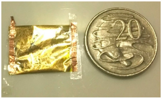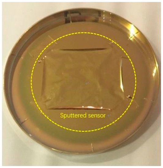 Figure 2 shows the output result of the sputtering process, which was taken off the sputtering device for experimental processes. Figure 3 shows the Scanning Electron Microscopic (SEM) image of the sputtered sensor. The zoomed view in the image shows the smoothness of the sputtering on a micro level. It can be seen that there are some black spots in the image in contrast to the sputtering white regions. These black spots represent the regions where the sputtering did not happen evenly. This could be due to the shadowing effect, which plays a pivotal role in the distribution of the incident particle flux. The reasons for this effect can be attributed to the angular distribution of the incident atoms on a long-range surface [40] or could be due to the irregular surface diffusion of the sensing area due to the roughening of the surface [41]. Although some of the regions display an uneven sputtering of gold or chromium, most parts of the sensor had a consistent sputtered layer of chromium and gold on the polyimide substrate. The unevenness of the sputtering of the thin-film gold layer in some regions did even affect the electrical and mechanical performance of the sensors. The final sensor patch is shown in Figure 4, where its size is compared to an AUD 20 cent to depict its miniaturised nature. The small size of the sensors increases their potential to be used for wearable sensing purposes.