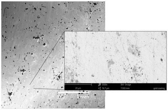 SEM image of the sputtered sensor. The zoomed view shows the quality of the sputtering on the sensing surface.