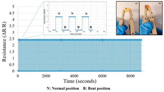 The sensors were employed for different kinds of strain-sensing applications where they were subjected to variable inputs in terms of pressure and temperature to determine their corresponding outputs. The change in the output of the sensors with respect to the applied pressure on the sensing surface was determined in terms of the change in relative resistance, as shown in the equivalent circuit in Figure 5. The responses were monitored using a HIOKI IM 3536 LCR metre that was connected to the copper tapes of the sensors via Kelvin probes. The impedance analyser, in turn, was connected to a laptop via a USB cable to collect the monitored data in Microsoft Excel using an automated data acquisition algorithm. Due to the resistive nature of the sensors, the instrument was operated in a DC mode where the voltage was varied to determine the changes in relative resistance and current. Firstly, the sensors were subjected to consecutive bending to determine the repeatability of their results. Figure 6 shows the output of the consecutive bending test where the sensors were bent in an oscillatory motion to determine the changes in the corresponding resistances. The bending was done manually to change the dimension of the sensors. The direction of the bending of the sensors is shown in the inset of Figure 6. The sensors were bent to a limit with a bending radius curvature of 12 mm. This value was chosen to avoid any kind of contact between the electrode tapes while in the bent position. The direction of the strain was perpendicular to the electrodes. The number of oscillatory cycles was continued to around 100 cycles to validate the repeatability of the response of the sensors. The number of cycles was limited to 100 as after this; the sensors started to acquire a bent shape in the direction of the bending. It is seen from Figure 6 that the sensors generated a constant response over the entire duration. Three cycles were randomly chosen (450–700 s) from this duration to distinguish the two positional differences of the sensors. Two different situations, namely ‘normal’ and ‘bent’ positions, have been considered for the conditions referring to the extended and flexed positions respectively for the sensors. The normal and bent positions in Figure 6 were ascribed as ‘N’ and ‘B’ respectively.