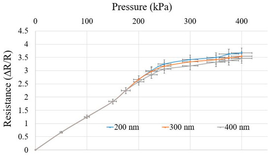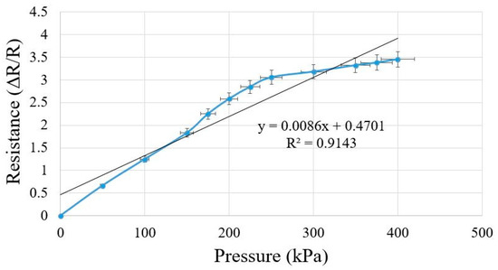 The variation of relative resistance with respect to pressure for sensors with 400 nm. The sensitivity of the sensors for this range was 0.0086 Ω/kPa.