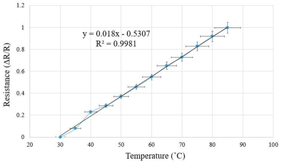 The resistance of the sensors decreased as the position was changed from normal to bent. The decrease in the relative resistance with respect to the applied strain can be attributed to the increase in current in the sensors, which is due to the increase in the interlinked connections of the gold particles in the sensing area of the prototypes. The sensors exerted very similar responses with each cycle, thus validating their repeatability. The response time of the sensors was less than one second. The repeatable nature in the response of these sensors is important for monitoring human motions, like flexible strain gauges [45,46]. The second experiment conducted on the sensor patches was to determine the change in relative resistance with respect to a change in pressure. The pressure was applied using a pressure tester metre SF500N. The pressure was applied centred on the sensing area of the prototypes. The change in the response with respect to pressure was studied for the three types of sensors, as shown in Figure 7. The range of pressure was kept constant between 0–400 kPa as this is the limit of pressure exerted on sensors in tactile sensing with human tactile sensing applications [47,48]. As can be seen from Figure 7, the sensors showed small resistive changes for the three types of sensors. The highest change in resistance took place for the sensor having a thickness of 200 nm of the thin-film gold layer. The reason for this phenomenon can be attributed to the increase in the current as a result of the increase in the inter-particle connection between the gold particles with a corresponding increase in the thickness in the layer. The sensitivity of the sensors was determined for the sensors having a thickness of 400 nm for the gold layer. Figure 8 shows the change in response of the sensors, where a linear trend line is fitted to obtain the slope. As seen from the figure, the sensitivity of these sensors for the pressure ranging between 0 and 400 kPa is 0.0086 Ω/ppm. The next experiment was performed by testing the behaviour of the sensors at a range of temperatures. Even though these sensors have been fabricated for strain-sensing purposes, the reason for analysing their behaviour with respect to temperature was to determine the temperature coefficient of resistance (α) of these sensors. Figure 9 shows the change in the resistance with respect to the temperature being varied between 25 °C and 85 °C. It is seen that the resistance values vary almost linearly with the temperature with a high coefficient of determination (R2). From Figure 8, the coefficient of thermal expansion was calculated to be around 0.016 Ω/°C. In accordance with the above two experiments, the sensors also responded to the changes in pressure for four different temperature values of 25 °C, 35 °C, 45 °C and 55 °C.