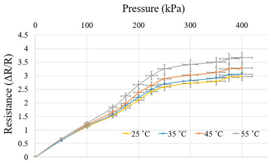 The reason for choosing these four temperature values can be attributed to most of the human-related tactile sensing experiments taking place within this range [49]. Figure 10 shows the change in the relative resistance with respect to the increase in pressure for the four values of temperature. The change in relative resistance increases with temperature for a particular pressure is due to the properties of the gold thin-films [50,51,52]. The reason behind this phenomenon can be attributed to the vibrational effect of the sputtered layer about their home positions, which causes an increase in thermal energy. The gauge factor (GF) was calculated for these temperature values to determine the variation with respect to temperature. It was seen that the G.F. varied between 4.9–6.6 when the temperature was increased from 25 °C to 55 °C.