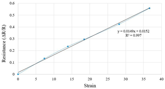 The response of the sensors in terms of change in relative resistance for the applied strain.