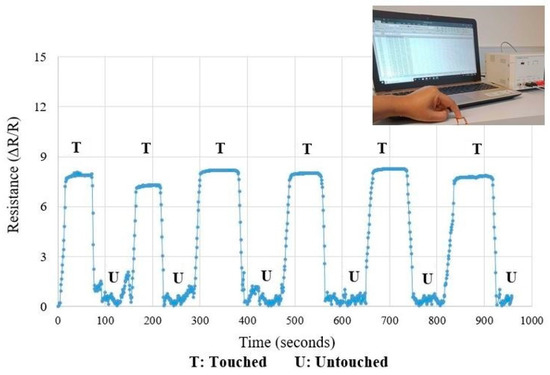 Next, the sensors were tested for tactile measurements where manual pressure was applied on the sensing (sputtered) area of the sensor patches. The sensor patches were fixed in one location with sticky tapes, and then their sensing area was touched. The reason for opting for manual pressure is to show the potentiality of these sensors for soft-touch tactile measurements [57]. Figure 12 shows the response of the patches to tactile sensing, while the inset of the figure shows the setup of applying pressure on the sensors. Two terms, namely ‘touched’ and ‘untouched’, denoted by ‘T’ and ‘U’, refers to the conditions of touching and refraining from touching the finger to the sensing area of the patches respectively. The tactile experiments were performed successfully with the relative resistance varying between two fixed ranges for the two corresponding conditions. It is seen that the range of resistance for tactile sensing is a little higher than in the other pressure sensing experiments. This behaviour can be attributed to two reasons: firstly, the change in the response was additionally affected by the permittivity of the skin; secondly, due to the exertion of a manual force on the skin, the pressure applied on the sensors for tactile sensing can be more than that of the other experiments. One of the reasons why the sensors did not obtain the same values when the pressure was released is possibly because the sputtered thin-film layers did not obtain the same orientation as they had in the previous cycle. When the sensor went back to the untouched position, due to the ultra-thin thickness of the substrates, the sensing area did not necessarily re-occupy its original shape, thus causing a slight change in the output resistance. The response of the sensors based on gentle touching can be considered when employing these sensors for tactile applications in electronic skins [58,59].