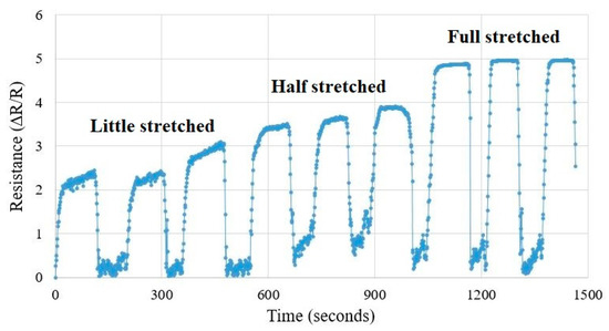 The response of the sensor patches with respect to the variation of tensile strain applied to them. The stretching of the sensors was varied from little stretched to full stretched condition to determine the increase in the corresponding resistance values.
