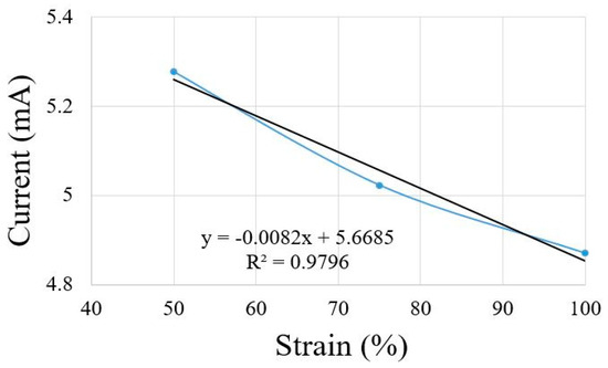 The next experiment for strain-induced applications was the change in the degree of the tensile strain applied on the sensor patches. This experiment tested the differences in the pressures exerted on the sensor patches for soft-touch tactile and robotic arm applications. Tensile stress measuring equipment (EXCEED E42 Universal Test Systems from MTS) was used for the experiments, and the prototypes were clamped from two sides. Due to the ultra-thin nature of the sensors, the connections were made carefully to avoid any bending during the clamping process, which could have affected the response of the sensors. One of the sides were pulled, keeping the side constant to determine the changes in relative resistance and current. The degree of strain was conducted by varying its amount for the sensors being in little stretched to full stretched condition. The little stretching of the sensors refers to the point where the sensors move a little bit from their initial position, where the fully stretched position refers to the situation just before breaking off the sensor. However, there was one assumption made during the simultaneous application of stress and the monitoring of the data. During the sputtered nature of the sensing surface, the effect of the cracking of the thin-film layer beyond a certain limit of stretching was considered negligible to avoid the complicacy of interconnection between the surface effects of polyimide and thin-film gold layer. The effect of cracking on the sensing surface demands a new field of study to determine the difference in responses caused due to the tension between the sputtered gold layer and the substrates beneath it. Figure 13 and Figure 14 show the change in the relative resistance and current respectively for different amounts of tensile strain. The relative change in resistance of the sensor patches increased on the application of the tensile strain, whereas the three consecutive cycles for each degree of stretching displayed a similar range of resistance values. Due to the increase in the relative resistance with respect to the applied strain, the corresponding output current decreased, as shown in Figure 14. The response of the sensor patches for different degrees of tensile strain can be advantageous for their uses in robotic industries, where the degree of strain can sometimes be a function of the amount of movement of robotic arms.