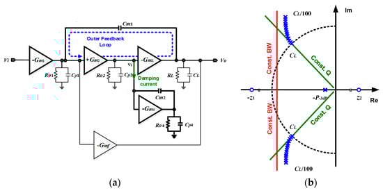 where the parameters are identified in Figure 2a. Comparing Equation (3) to Equation (1), it is easy to find that DFCFC amplifiers can achieve wider bandwidth by a factor of C m 2 / C p 2 , which is larger than 1 since Cp2 is the parasitic capacitance and is often less than Cm2. According to [10], the Q(DFCFC) can be suppressed by injecting more damping current into damping factor control (DFC) block. This can be realized by reducing the output impedance of the second gain stage (v1 in Figure 2a) in the high-frequency range. The equivalent impedance looking into DFC block is described by