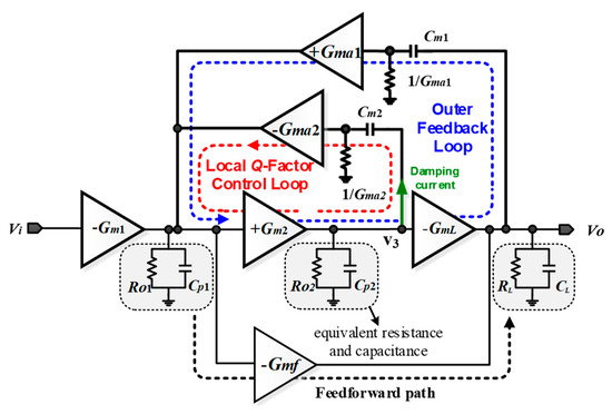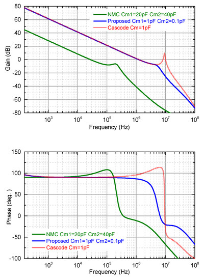 31. Cheng, Q.; Li, W.; Tang, X.; Guo, J. A cascode Miller compensated three-stage amplifier with local Q-factor control for wide capacitive load applications. In Proceedings of the IEEE International Symposium on Circuits and Systems (ISCAS), Baltimore, MD, USA, 28–31 May 2017; pp. 954–957. [Google Scholar]