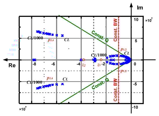 Figure 6. Pole locus of the proposed amplifier when the load capacitance varies from CL to CL/1000 (scaled).