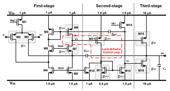 The schematic of the proposed three-stage amplifier with CLQC technique is depicted in Figure 8 [31]. The 1st stage uses a folded cascode structure (M1–M9). The 2nd stage adopts a current mirror to form the non-inverting stage (M10–M14). Assuming the transconductance of M11, M12 and M13 are gm2,1, gm2,2 and gm2,3, respectively, the overall transconductance gm2 is, therefore (gm2,1*gm2,3)/gm2,2. The 3rd stage is formed by a common-source stage (M16). The cascode Miller compensation is realized by Cm1 and the common-gate stage (M7). The local Q-factor control block contains Miller capacitor Cm2 and the common-source stage (M9). The NMOS transistor M15 generates a feed-forward path, which is helpful to enhance the transient performance. The quiescent current of the amplifier core circuit for each branch is labeled properly in Figure 8.