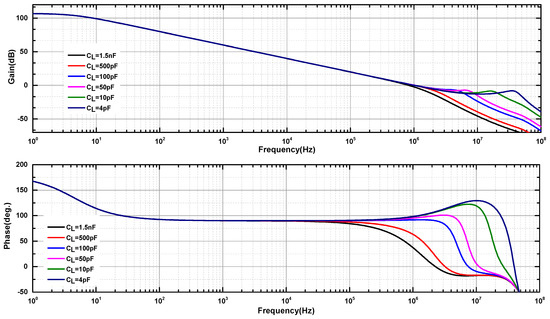 As to optimize the compensation capacitor value of the proposed CLQC amplifier, the value of Cm1 and Cm2 are set to be 1 and 0.05 pF, respectively, for the extreme capacitive load ranging from 4 pF to 1.5 nF. The values of compensation capacitors are obtained from the analysis in the previous section. The value of Cm1 is optimized according to the tradeoff between PM and GBW from Equations (12) and (13). The Cm2 value is obtained from the worst-case Q-factor (Q(CLQC)_max) value according to Equations (17) and (18). The Q(CLQC)_max is obtained from the maximum gain peak magnitude of 20log(Q) caused by the complex pole. In this design, the maximum gain peak is suppressed to 3.5 dB which is about 10 dB smaller than the worst-case gain margin and the corresponding Q(CLQC)_max value is 1.5.
