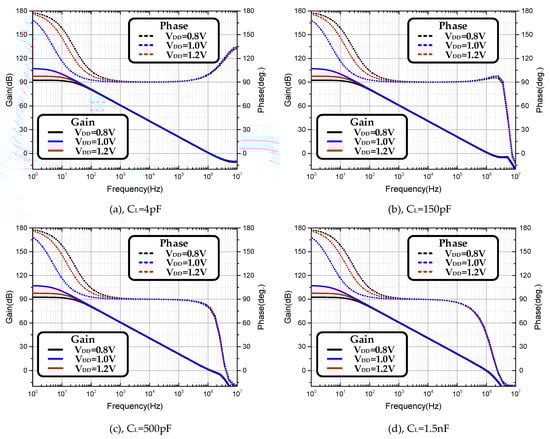 Figure 11. AC simulation results (ad) with CL (4 pF to 1.5 nF) when VDD varies from 0.8 to 1.2 V.
