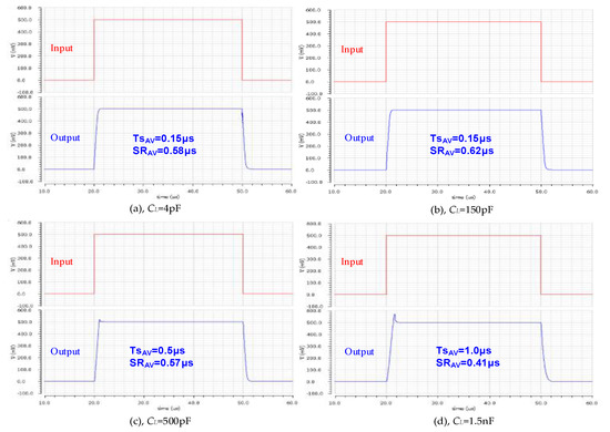 The simulated transient responses of the proposed amplifier in unity-gain configuration with a 500 mV step for CL to be 4 pF, 150 pF, 500 pF and 1.5 nF are shown in Figure 12a–d. With 4-pF loading capacitance, the average slew rate is 0.58 V/μs, and the average 1% settling time is 0.15 μs. When the load capacitance is 150 pF, the relevant SR and settling time are 0.62 V/μs and 0.15 μs, respectively. If a 500-pF capacitive load is applied at the output, the average SR and average 1% settling time are 0.57 V/μs and 0.5 μs, respectively. When CL is increased to 1.5 nF, the corresponding SR and average 1% settling time are 0.41 V/μs and 1.0 μs, respectively.