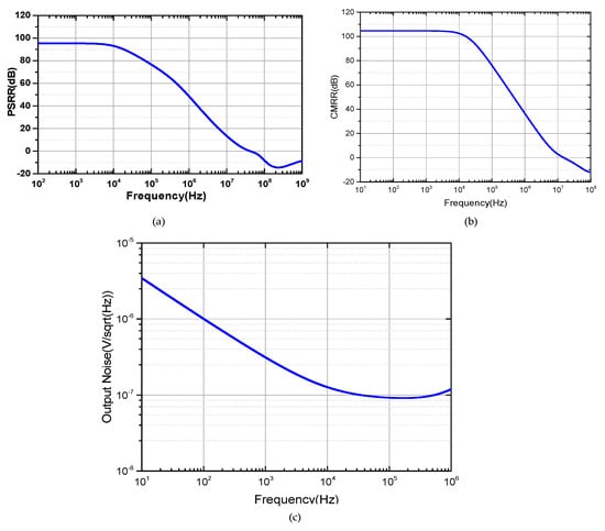 The simulation results of power-supply rejection ratio (PSRR) and common-mode rejection ratio (CMRR) with open-loop response are depicted in Figure 13a,b. The PSRR and CMRR are around 95 and 105 dB at 1 kHz, respectively.