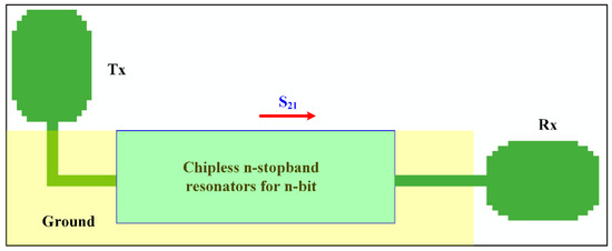 Different methods are reported in the literature for data encoding in chipless RFID tags. Generally, these encoding techniques can be classified into various domains, such as time, frequency, phase, and hybrid-domains [3]. In time-domain-based systems [4,5], the RFID reader interrogates the tag with a sequence of short pulses. Subsequently, the tag receives the interrogating pulses and then retransmits the response signal as a train of echoes with some time delays. The presence or absence of echoes and their position along the time axis are used to read out the tag ID. The surface acoustic wave (SAW) chipless RFID tag is the most popular and commercial time-domain-based chipless tag [6]. However, these tags are not recommended for cost-effective applications, owing to the high material costs and complex fabrication process. In frequency-based chipless RFID systems [7,8], the reader interrogates the tag with an electromagnetic (EM) waveform and then the tag retransmits (or backscatters) the response to the RFID reader. In the phase domain, differences in the phase profile are used to encode the bits [9,10]. In hybrid-domain encoding techniques, more than one domain is used. These additional domains include phase–frequency [11,12], time–frequency [13], impedance loading [14], polarization–phase [15], and frequency–position [16]. However, as mentioned in [17], for a significant number of bits, hybrid-domain techniques still require a very high spectral bandwidth and the resultant configuration in this case will not be matched for low-cost readers.