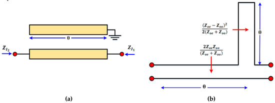 The schematic diagram and equivalent circuit of the proposed coupled-line resonator are shown in Figure 2. This coupled-line resonator can be analyzed in the manner suggested by Jones and Bolljahn [35]. The stopband characteristics of this resonator can be explained in terms of image impedances ZI1 and ZI2.