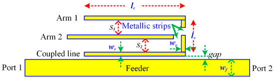 In our design, the short circuit in Figure 3 can be replaced by a quarter-wavelength open-circuit stub at f1 or f2, where f1 and f2 are close to each other. For a proof of concept, the proposed resonator shown in Figure 4 is designed to have f1 and f2 at 5 and 5.2 GHz, respectively. The circuit was designed on the Duroid substrate of a dielectric constant 2.2 and thickness 0.78 mm. The physical parameters of the circuit shown in Figure 4 are given in Table 1. This coupled line of length lc and width wc can be connected to arm 1, arm 2, or both arms using short metallic strips through a vertical arm of length lv and width wv. This resonator can be reconfigured in order to present a quad-state.