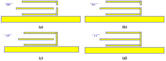 The various types of states can be obtained using the connections shown in Figure 5. The first state, S1-state, is achieved when arms 1 and 2 are not connected to the vertical line. No resonance can be observed in the band of operation, and this case is represented by the code 00. If only arm 2 is connected to the vertical line by a short metallic strip, the resonator resonance frequency in this case is f2 and the resonator is represented by the code 01 as shown in Figure 5b (S2-state). The third case, S3-state, is when only arm 1 is connected to the vertical line by a short metallic strip. The resonance frequency is f1 and this state is represented by the code 10. In the fourth sate, S4-state, both arms are connected to the vertical coupled line. Therefore, the resonance occurs at f1 and f2 and the resonator is represented by the code 11. These four possible states are summarized in Table 2.