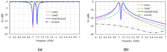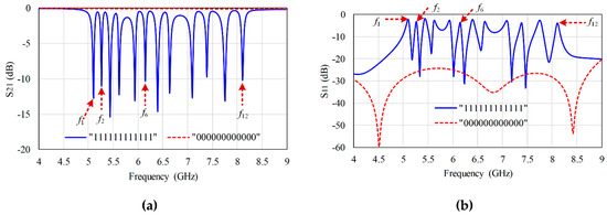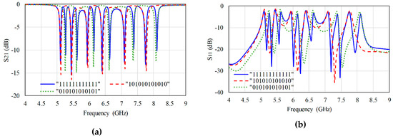Four configurations were developed to validate the concept. The first structure is shown in Figure 7, where all the resonators are connected to represent the code 11 for each one. Therefore, the configuration code is 111111111111. The second configuration represents all zeros, where the two arms of all resonators are not connected. The third configuration represents code 101010101010, and obtained with arms 1 of all the resonators connected and arms 2 not connected. The fourth configuration represents 010101010101, and consists of arms 2 of all the resonators connected and arms 1 not connected. The simulation results of S21 and S11 of the first two codes are shown in Figure 8. The simulation results of the first, third, and fourth codes are shown in Figure 9. It must be noted from this figure that almost no frequency shift was noticed when switching any resonator from one code to another. Many other codes, not presented in this paper, such as 011110011110, 110011001100, and 001100110011, were designed and verified.