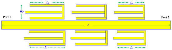 A six-resonator circuit based on the proposed resonator discussed in the previous section was developed on the Duroid substrate of a dielectric constant 2.2 and thickness 0.78 mm. The CST Microwave Studio was used to design and simulate the proposed tag. This structure was designed to maintain the frequency span for each resonator at approximately 200 MHz. The frequency span between each two adjacent resonators was also chosen to be approximately 200 MHz. The structure layout is shown in Figure 7. For the operation from 5.4 to 8 GHz, the resonator lengths were selected from L1 = 9.4 mm to L6 = 5.5 mm. The separation between the adjacent resonators was 1 mm. The feeder width was designed for a characteristic impedance of 50 Ω, which resulted in a width of 2.4 mm for the chosen substrate. The total length and width of the structure was 29.4 and 12.6 mm, respectively.