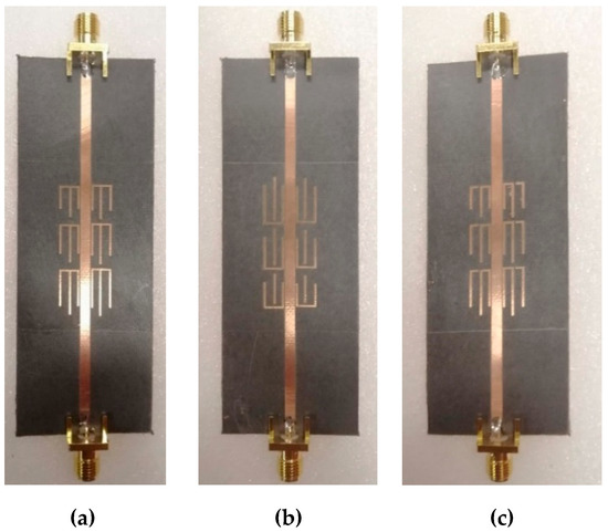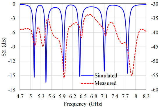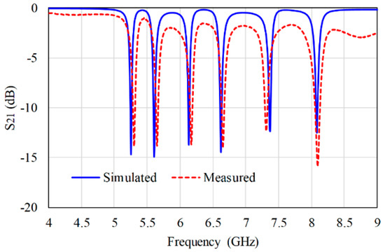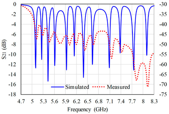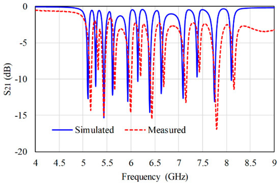 The three codes 111111111111, 101010101010, and 010101010101 were implemented and their photographs are shown in Figure 10. The measured and simulated S21 were compared as shown in Figure 11, Figure 12 and Figure 13. Only very small shifts to higher frequency were noticed in the measurements.